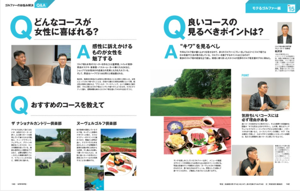 今回、弊社が受け持ったのは、モテるゴルファー編として、コースのどんな点に着目するかという観点と女性に受けるポイントがどのような点なのか、をお答えしています。