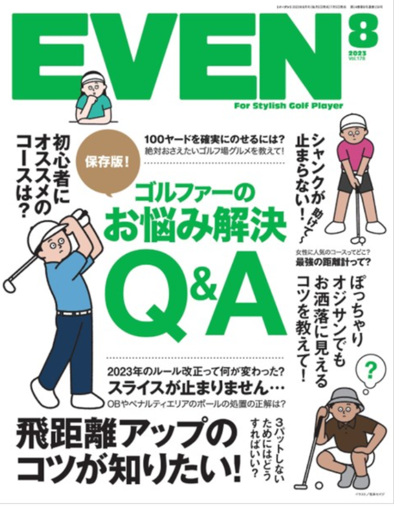 ゴルフの月刊誌EVEN8月号に弊社の取材記事が掲載されました。この号は「ゴルファーのお悩み解決Q&A」というタイトルで、様々な角度から、ゴルファーのお悩みに答える特集となっています。